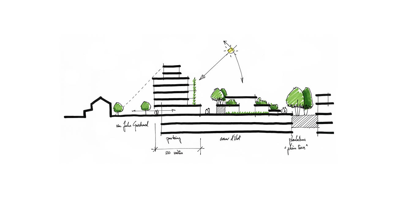 Le Foyer Rémois en tant qu’aménageur, a souhaité d’emblée porter un projet ambitieux. Comment répondre à la complexité de la ville d’aujourd’hui et parallèlement imaginer de nouvelles façons d’habiter et de vivre ensemble ? Pour tenter de répondre à cette question, un travail de réflexion a été entrepris au niveau de la programmation. La volonté première est de soutenir un projet basé sur la mixité fonctionnelle, intégrant de façon innovante les problématiques environnementales et sociales. L’échelle du projet en fait un élément majeur de la composition urbaine du Faubourg de Laon. Il s’agit ici d’imaginer un fragment de ville parfaitement inséré dans la trame urbaine. Le projet est scindé en 2 phases. La première est constituée de plusieurs entités : des logements collectifs, de l’hébergement pour jeunes actifs et des locaux d’activités tertiaires et commerciales. L’ensemble est implanté sur un parking souterrain. La seconde phase, qui va tendre à compléter la mixité fonctionnelle du quartier, aura une vocation plus commerciale (commerces de proximité, services, hôtel). La création de ce deuxième îlot dessinera un mail qui reliera la rue Jules Guichard à la place située devant le groupe scolaire Anquetil.
