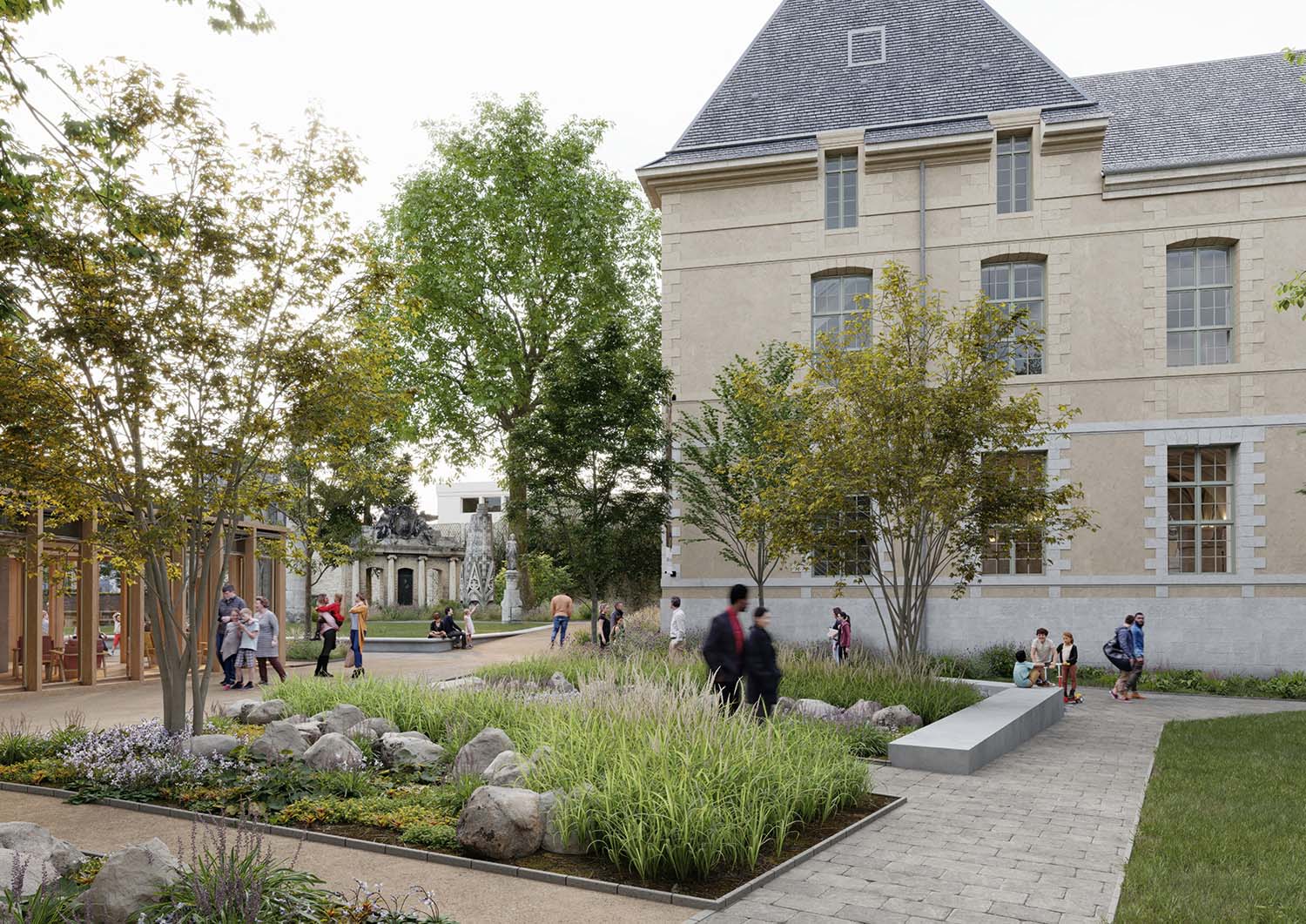 Situé en cœur de ville dans un espace paysagé, le projet se développe entre le couvent classé MH, dont la cour sera recouverte d’une verrière contemporaine, la partie reconstruite dans les années 60 et la partie neuve qui culmine en belvédère au cœur du bâtiment, offrant une vue à 360° sur le paysage rouennais. Le nouveau Pôle Muséal Beauvoisine est conçu comme le prototype d’une nouvelle génération de musées qui intègrent les enseignements de la pluridisciplinarité scientifique pour créer un espace de rencontre, de réflexion et de partage autour d’une nouvelle définition des relations entre les humains et la nature.