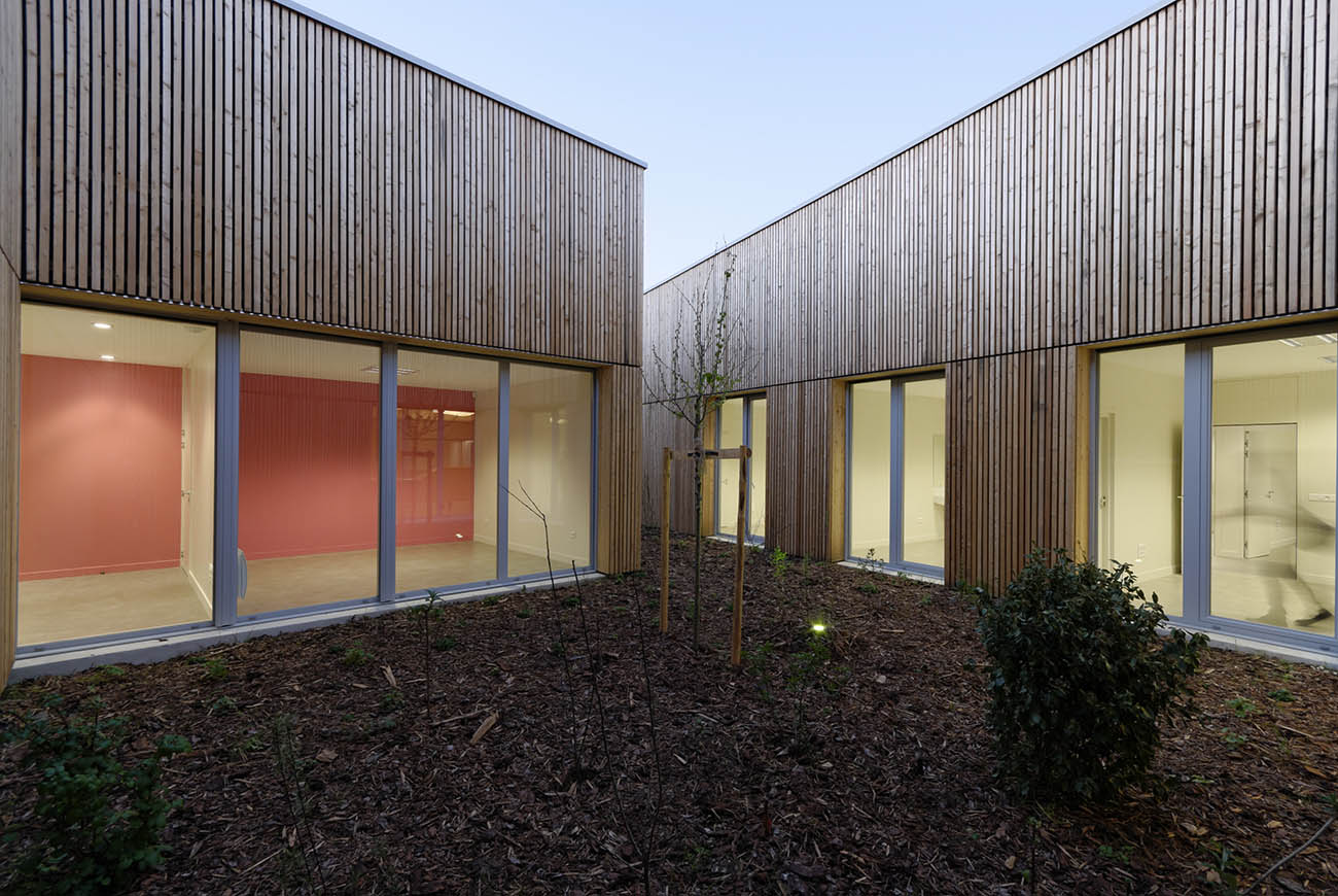 L’organisation fonctionnelle est particulièrement simple. Un hall commun donne accès à quatre zones dédiées : la médecine générale, le pôle dentaire, les kinésithérapeutes/ paramédical et les espaces mutualisés. Ces quatre entités longent deux patios qui apportent une lumière naturelle de qualité dans les circulations. Ces deux patios paysagers de taille modeste, constituent une sorte de micro-paysage.